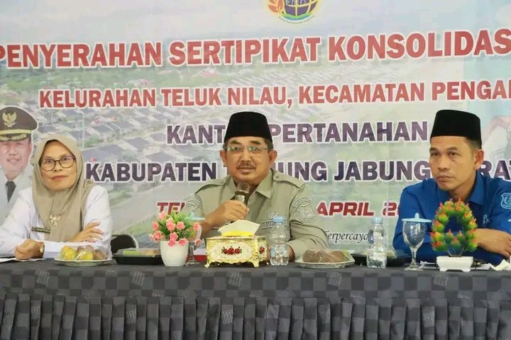 Acara tersebut turut dihadiri oleh Kepala Kantor Pertanahan Kabupaten Tanjung Jabung Barat, Camat Pengabuan, Kepala BKAD, Lurah Teluk Nilau, serta masyarakat penerima sertifikat konsolidasi tanah.